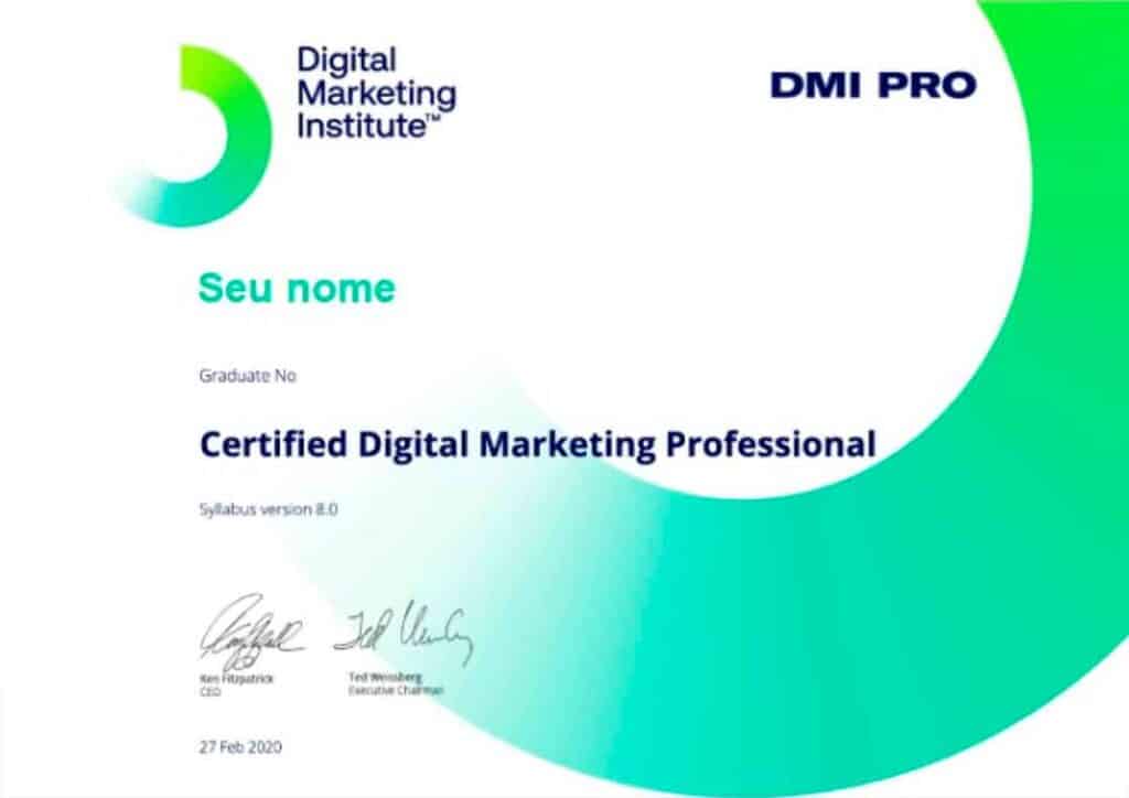 A matrícula no curso inclui a taxa de inscrição na prova* de Certificação Internacional do Digital Marketing Institute (DMI), que custa aproximadamente R$ 980,00.